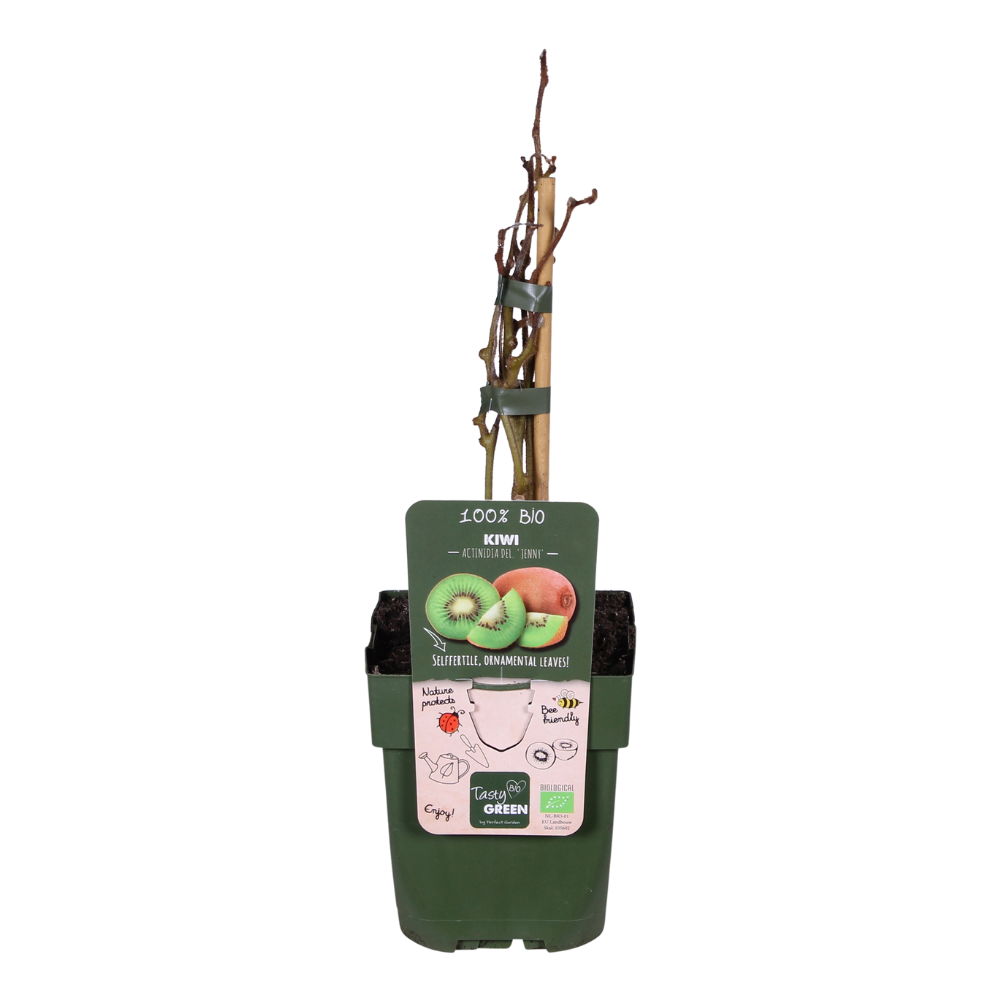 Tasty Green, 100% biologisch gekweekt fruit. Dat wil zeggen dat er tijdens de teelt uitsluitend plantaardige en dierlijke materialen gebruikt zijn. De pot en het etiket zijn gemaakt van gerecycled plastic en daarom een schone oplossing voor het milieu. ‘Actinidia delciosioa Jenny’ is een gemakkelijke en zelfbestuivende kiwi. De kiwi vind zijn oorsprong in China. In het begin van de 20e eeuw werden er zaden naar Nieuw-Zeeland gehaald. Toen de kiwi een belangrijk export product werd is de plant vernoemd naar de bekende loopvogel, de Kiwi. Het is een snel groeiende slingerende klimplant en kan het beste tegen een klimrek, schutting of pergola geplaatst worden. De kiwi bloeit in de maanden mei en juni met wit-roze bloemen. Begin september zullen de eerste rijpe vruchten verschijnen. Houdt er rekening mee dat het enkele jaren kan duren voordat de plant vruchten gaat geven. Over het algemeen duurt dit zo’n drie tot vijf jaar. De vruchten hebben een harige schil, zijn ovaal van vorm en hebben heldergroen vruchtvlees, met een witte kern en een ring van zwarte pitjes rondom deze kern. De kiwi is gezond en bevat veel vitamine C.