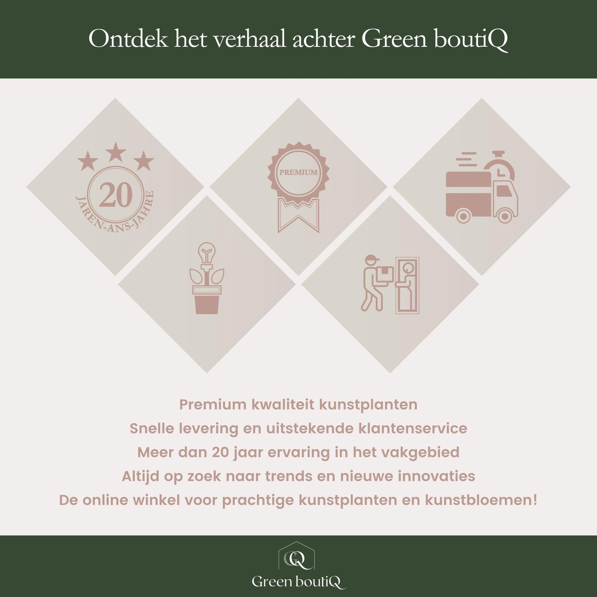 Wil je een echt pronkstuk in huis hebben? Combineer ons Bouquet electric love dan met een vaas uit onze collectie. Green boutiQ biedt een collectie aan elegante vazen, waarmee je keer op keer indruk maakt. Kies je favoriete vaas uit onze assortiment en laat je kunstbloemen stralen als nooit tevoren. Onze kunstboeketten staan bekend om hun hoge kwaliteit. Wat dat betekent? Duurzaam genieten! Bestel het kunstboeket vandaag nog, dan staat het snel te pronken in jouw woning!