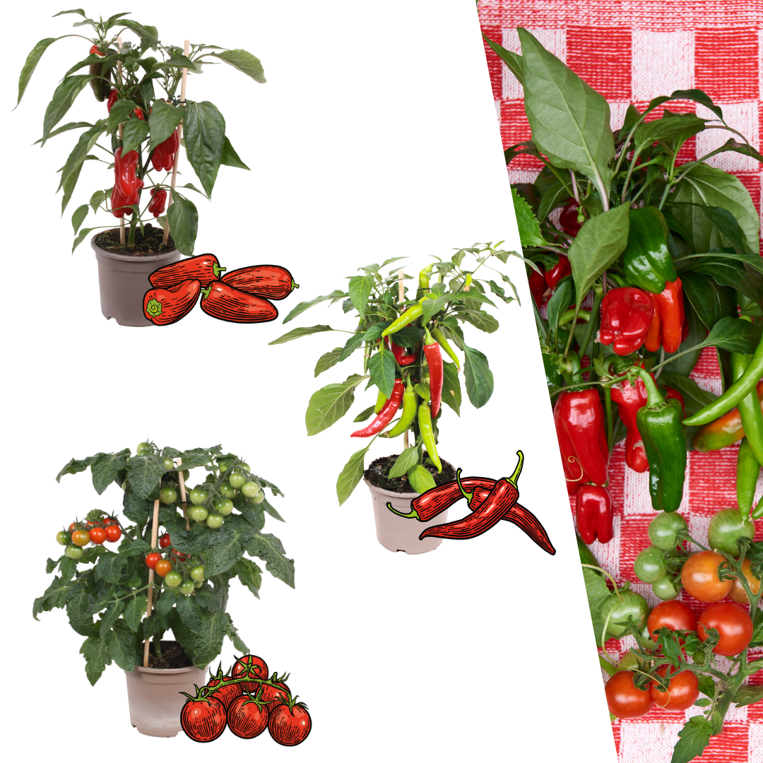 Rode Plukgroente Mix van 3 Planten – Cherry Tomaat, Rode Snack Paprika, Rode Hete Peper (Ø 14 cm – ↨ 45 cm)